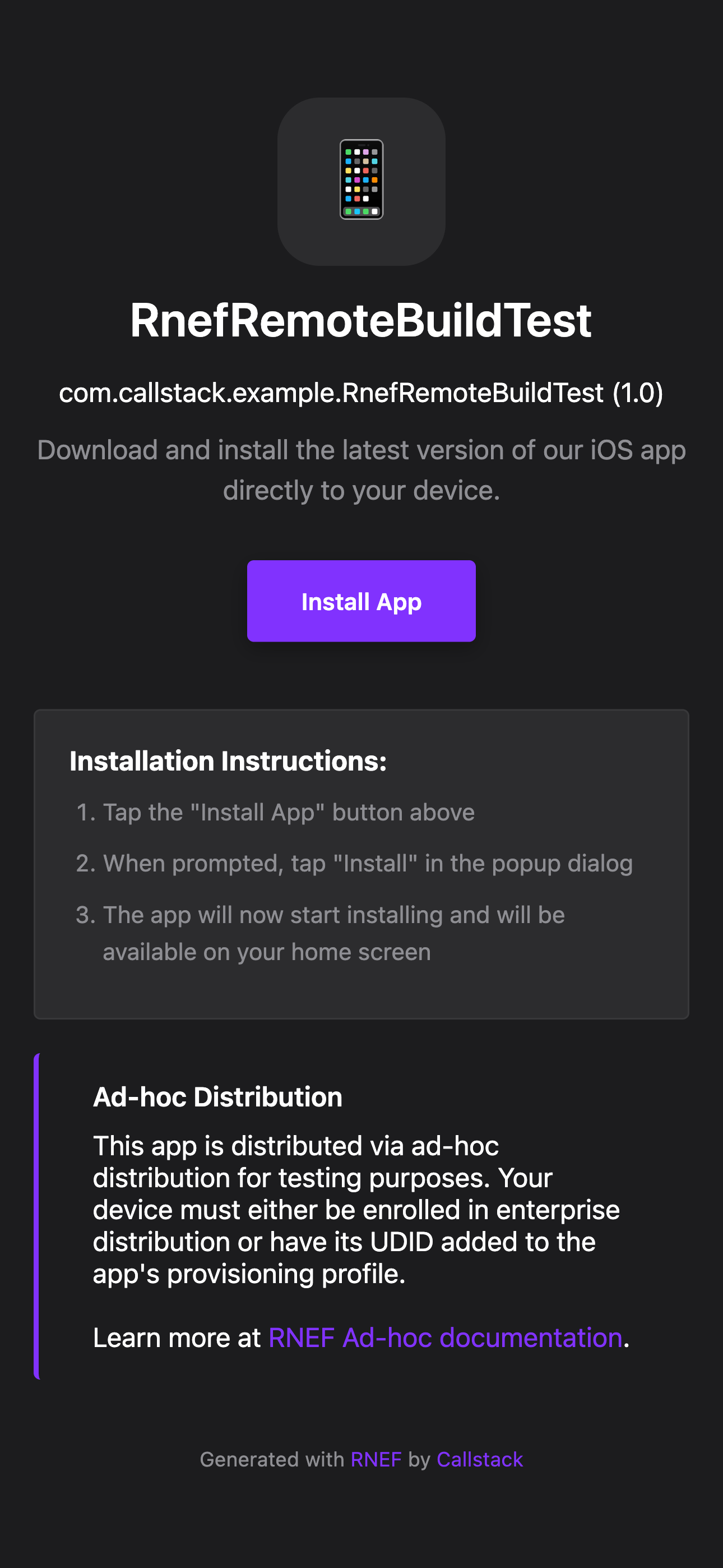 <directory>/ad-hoc/<artifactName>/<AppName>.ipaindex.html landing page (make sure it's accessible for testers)manifest.plistThis index.html file will display an ad-hoc distribution web portal, allowing developers and testers to install apps on their provisioned devices by simply clicking "Install App".